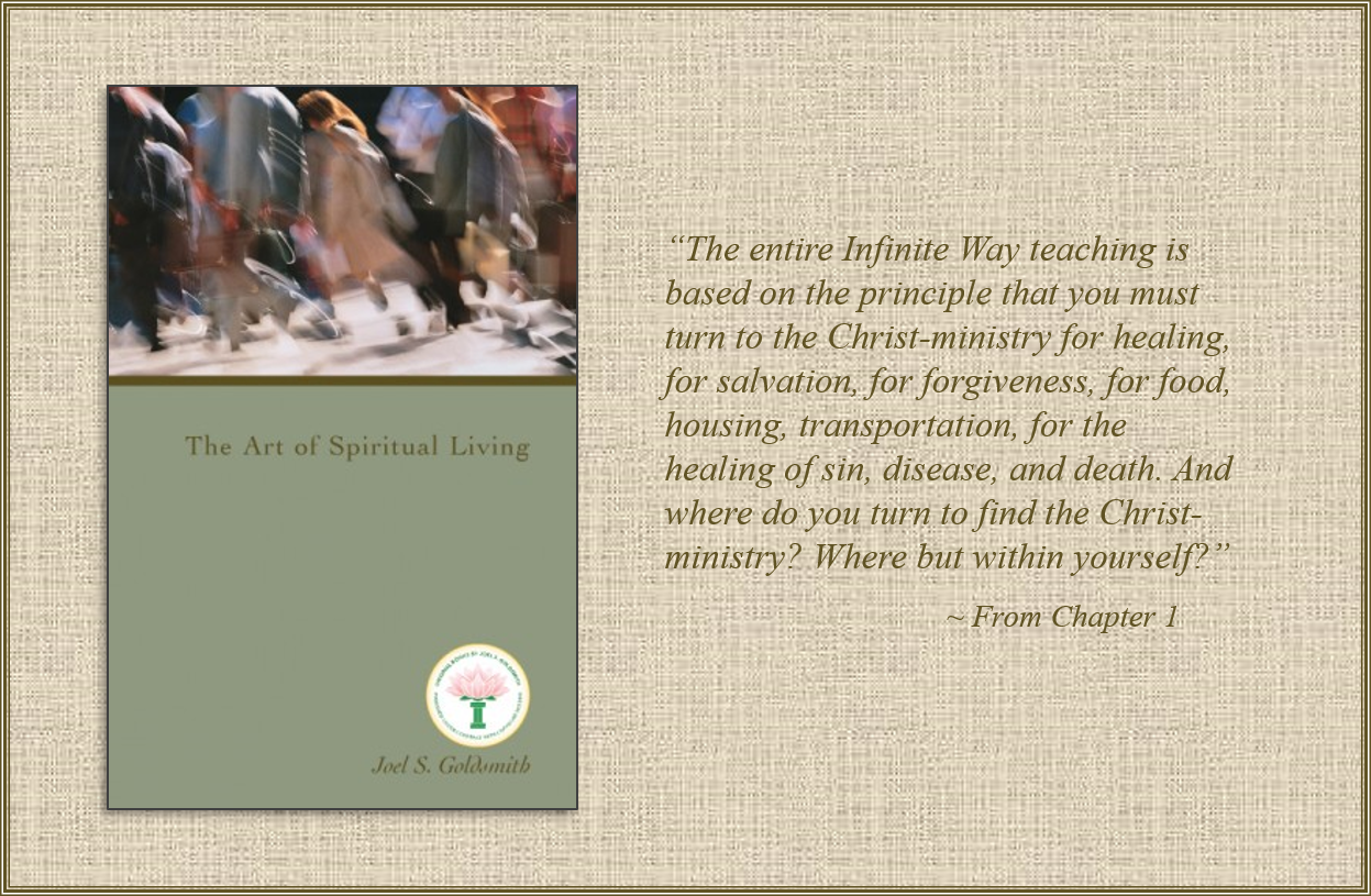 “The entire Infinite Way teaching is based on the principle that you must turn to the Christ-ministry for healing, for salvation, for forgiveness, for food, housing, transportation, for the healing of sin, disease, and death. And where do you turn to find the Christ-ministry? Where but within yourself?”