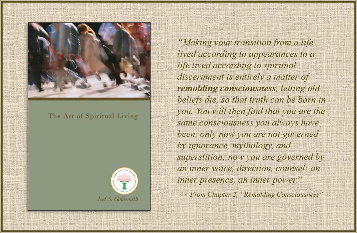 The basis for this chapter is Recording #484B, from the 1962 Maui Special Class, with the title “Remolding Your Consciousness.” This recording is no longer available on this site. If you subscribe to the Joel Goldsmith Streaming Service, you can listen to it there. To purchase the recording or the transcript from The Infinite Way Office, click/tap here.