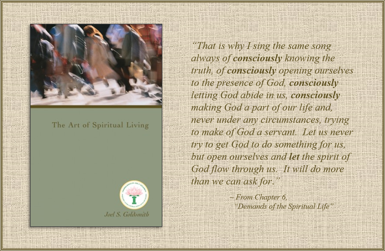 Once again, this chapter is a call to practice—to practice consciously connecting God with our lives.  In fact, Joel uses the word “consciously” or “conscious” over 25 times in this chapter!  “Consciously” means “in a way that is deliberate and intentional; in a way that shows one is aware of what one is doing.”  Joel suggests that we be vigilant about  consciously knowing the truth with every situation that arises in our experience from the moment we awaken in the morning; consciously acknowledging God in all our ways; consciously keeping our mind, heart, and soul alive and alert in God.  So practice is really the best “study” for this chapter.  As Joel says at the end of the chapter: